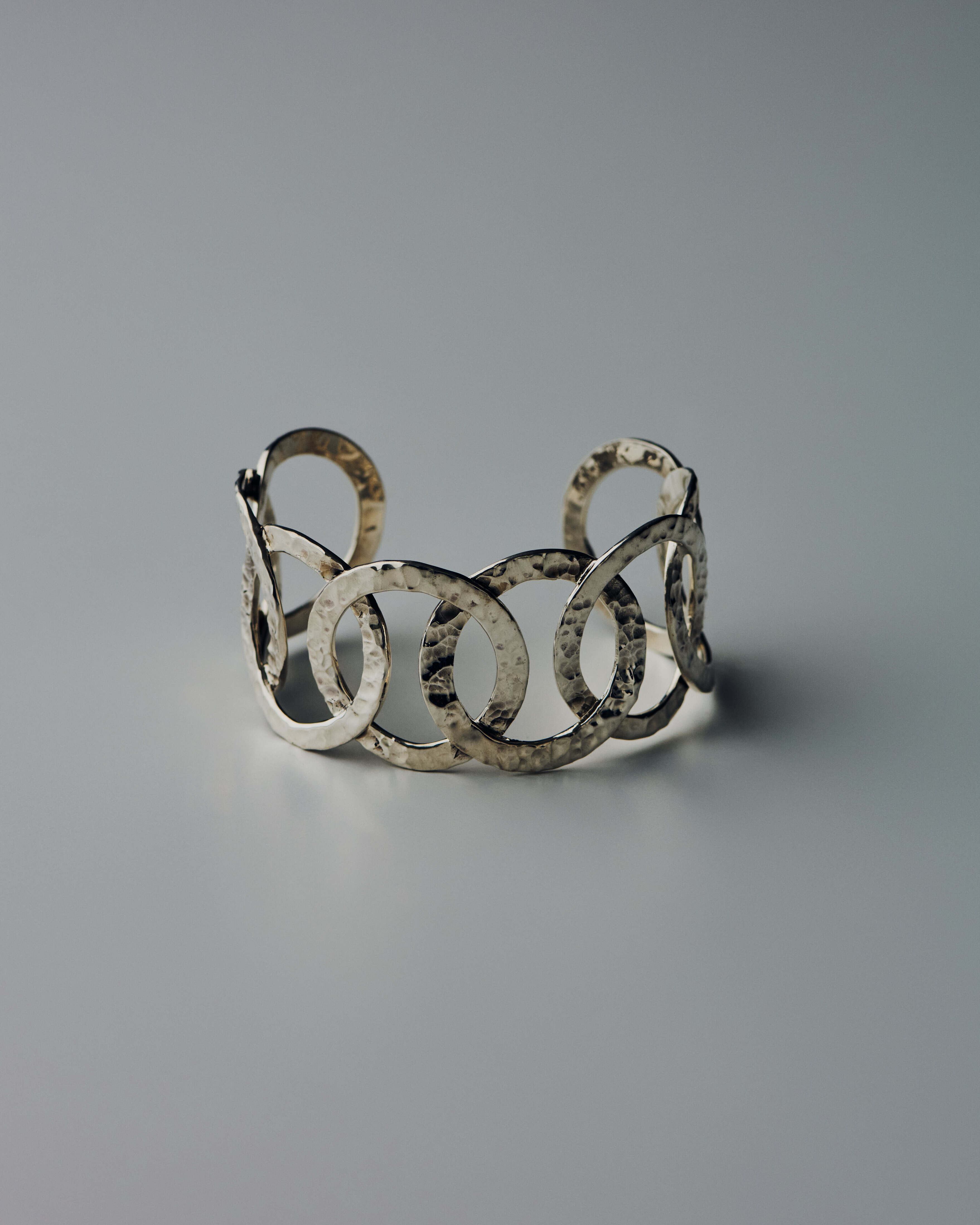 シルバーの光沢が美しい「round hammered cuff bracelet」。ハンマード加工による独特のテクスチャーが、華やかさと洗練さを両立させているアイテムです。